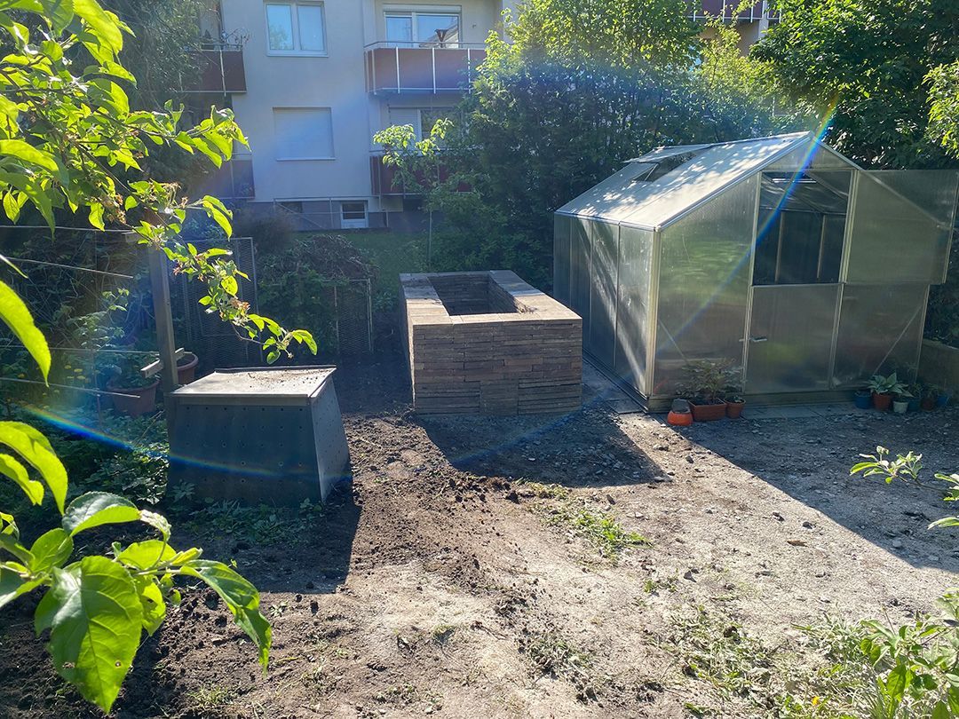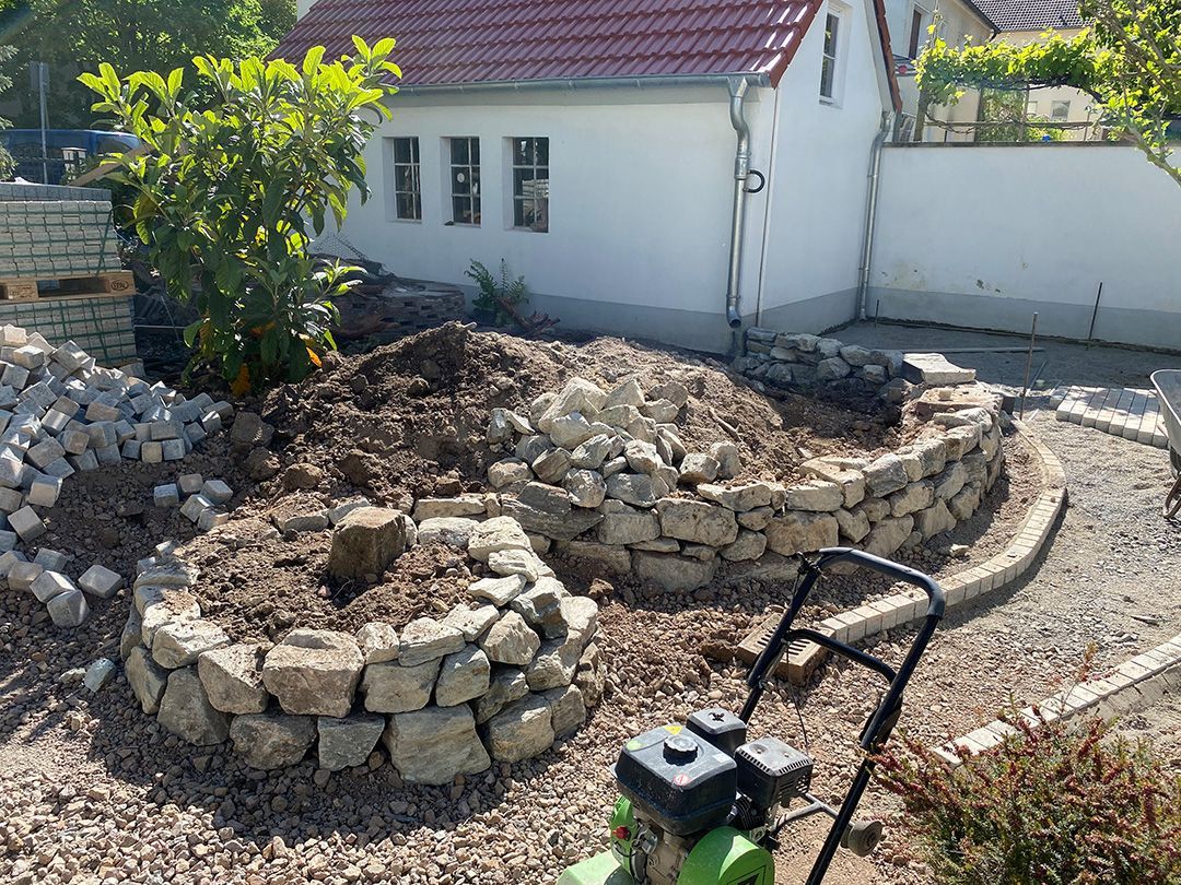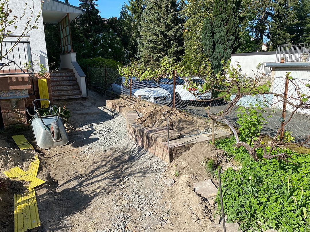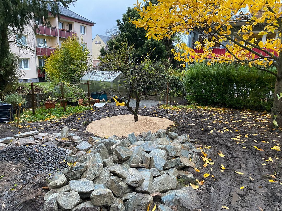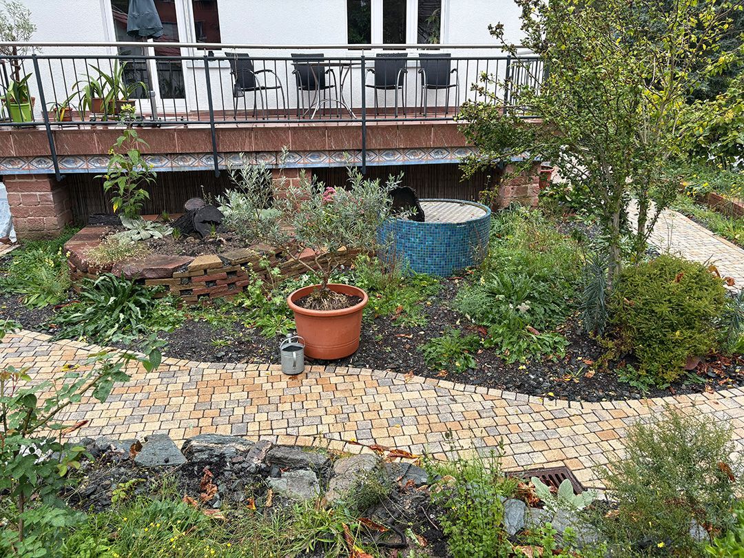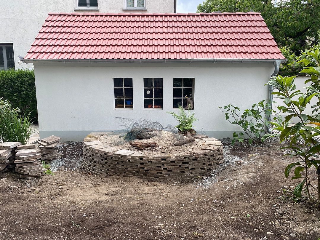 Alle Wege sollten erneuert werden und der Garten pflegeleichter sein. Eine Herausfordung bei über 200qm Betonflächen. Um den ökologischen Fußabdruck dennoch etwas zu senken sollte möglichst alles davon wiederverwendet werden. Umgesetzt in diversen Hochbeeten, gefüllt mit dem vorhandenen Unterbau entstehen diverse unkrautfreie Flächen für Saum, schattige nährstoffreiche und sonnige Magerbeete, Sand-Mager-Rasen, Sandarium bis hin zum Gemüse-Hochbeet. Schon nach einem Sommer sind erste Erfolge zu erkennen.