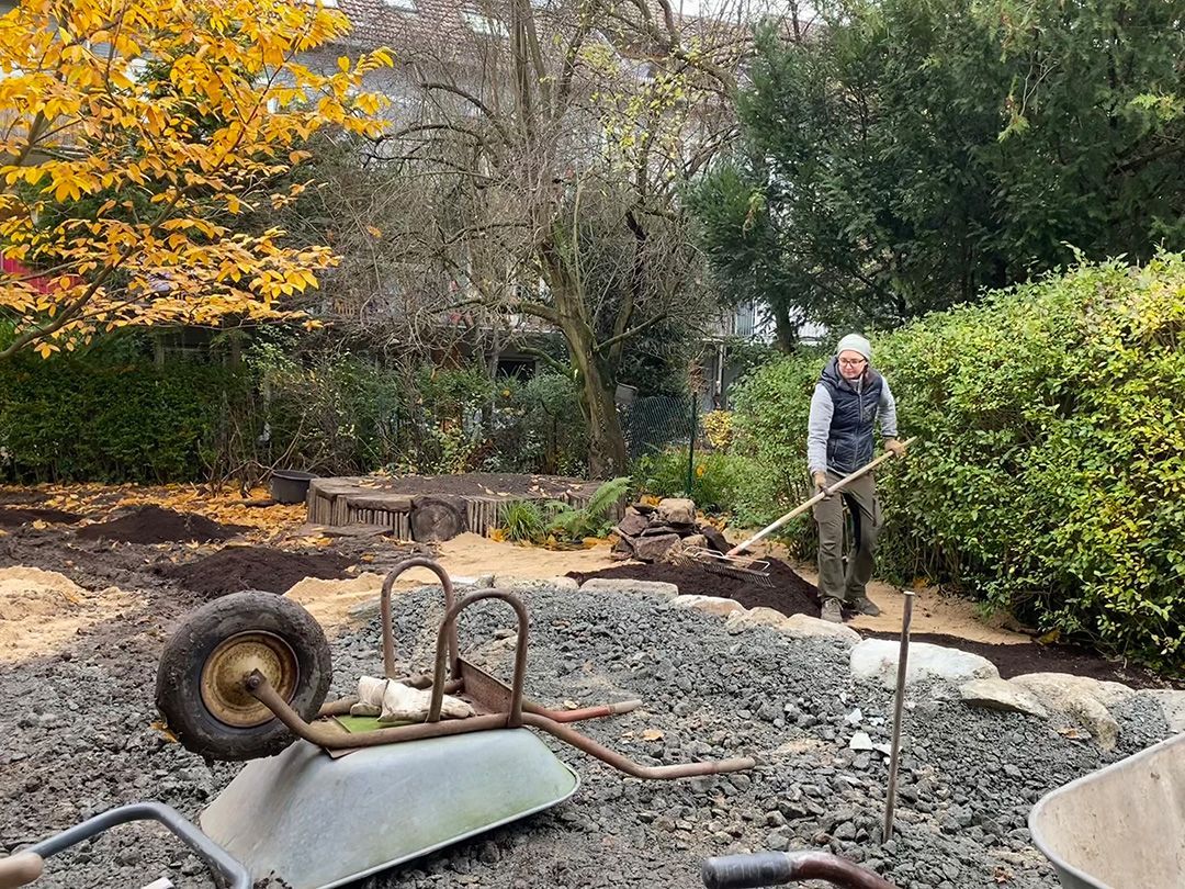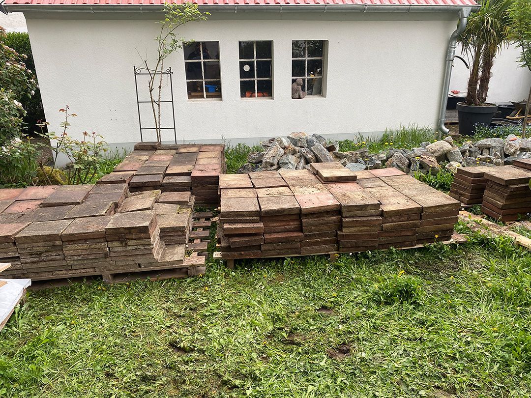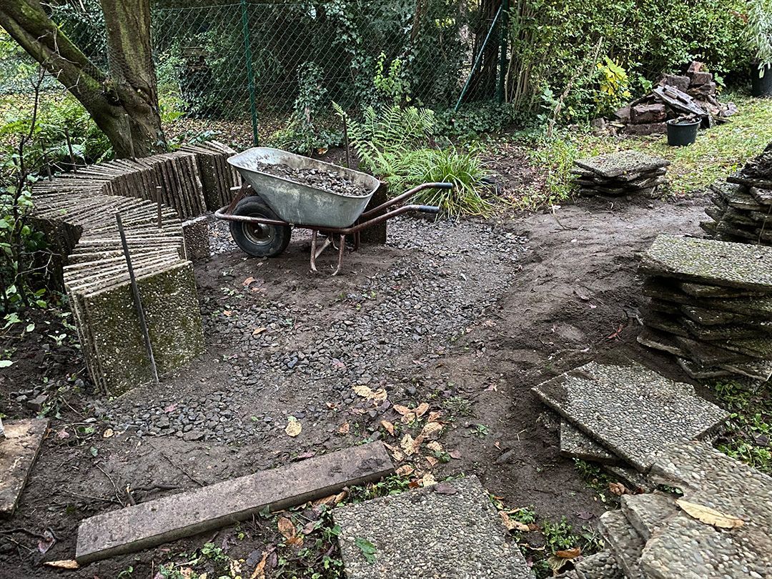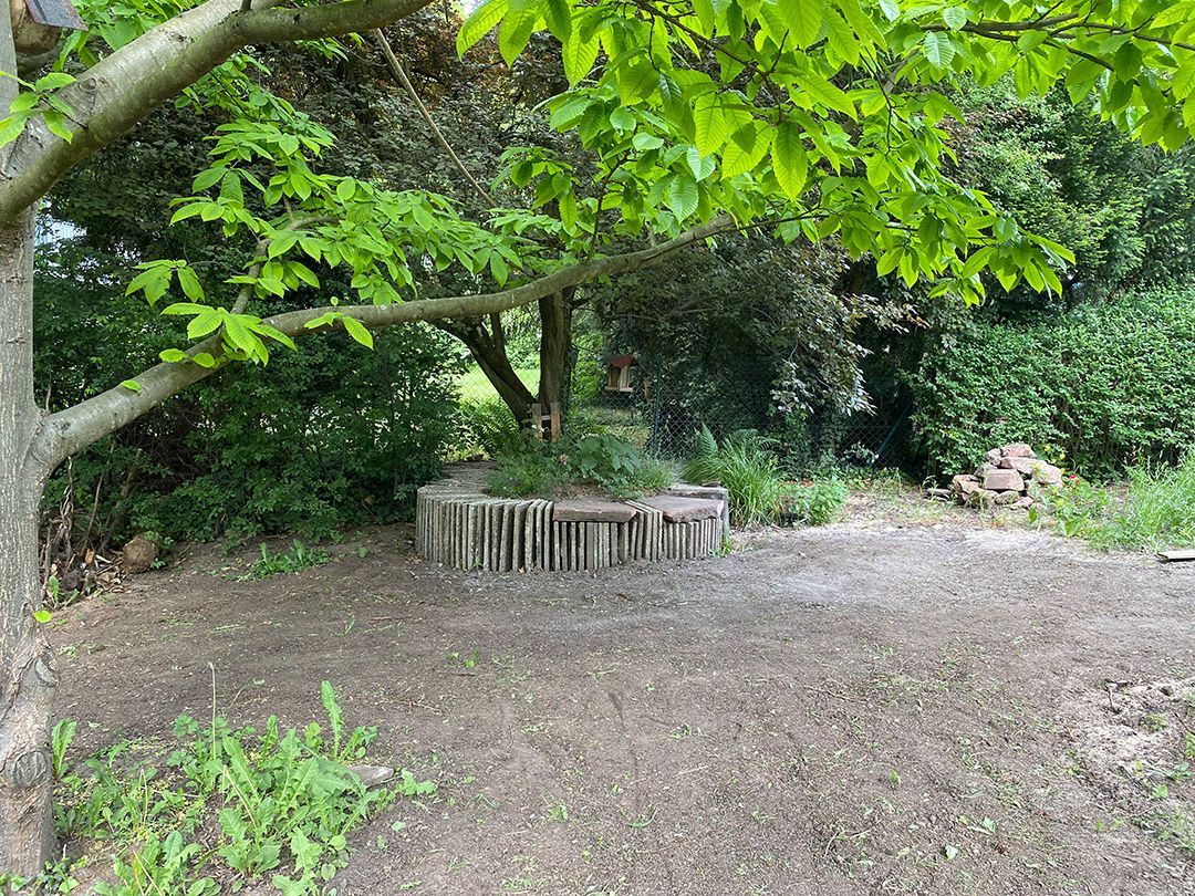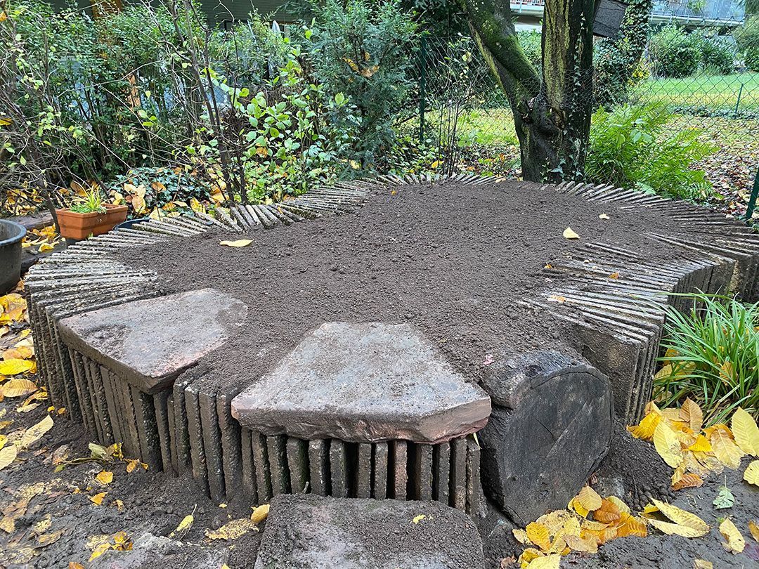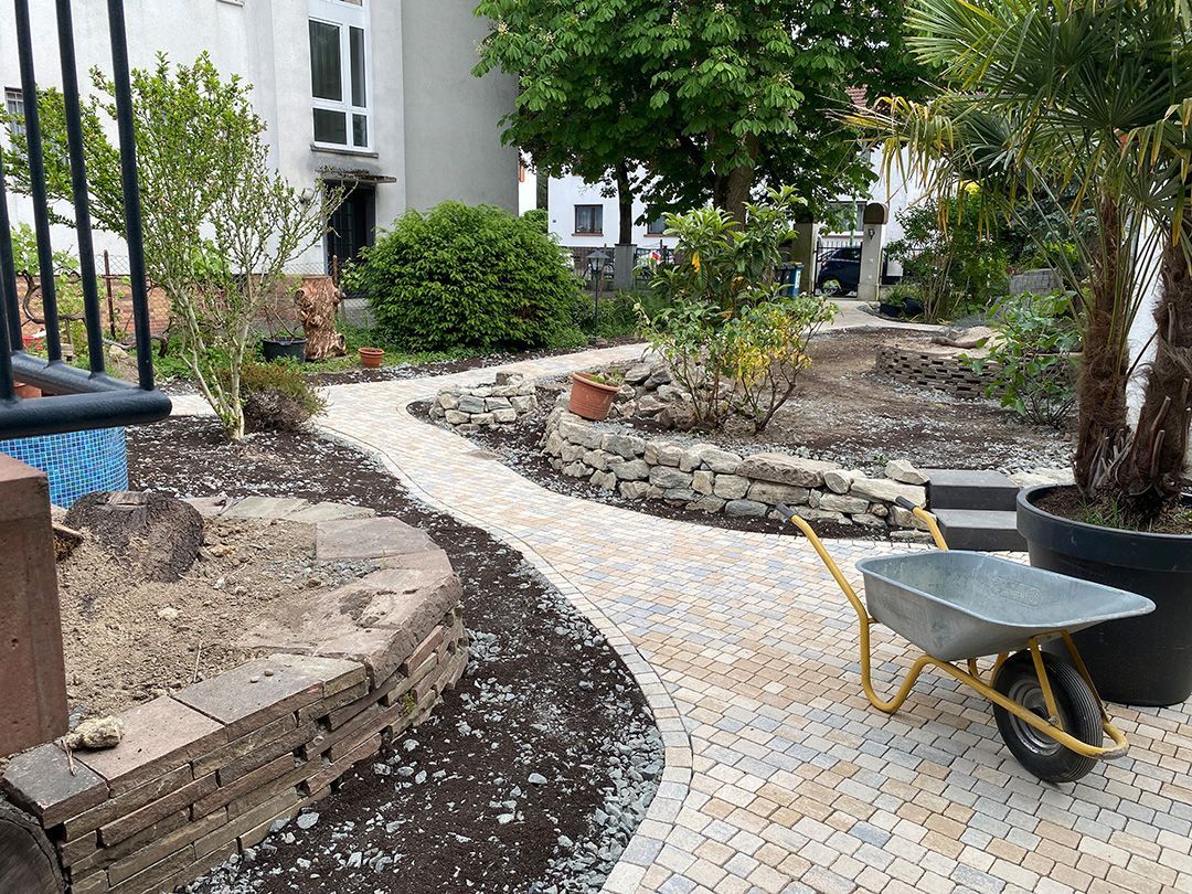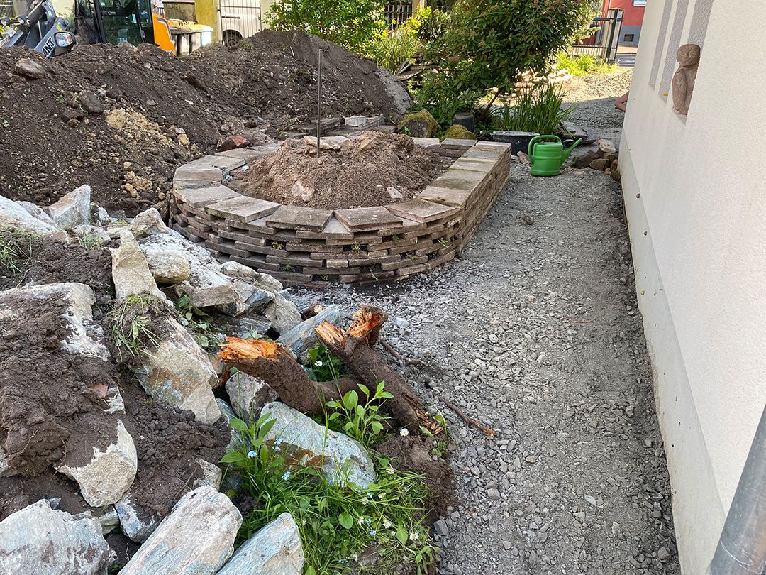Alle Wege sollten erneuert werden und der Garten pflegeleichter sein. Eine Herausfordung bei über 200qm Betonflächen. Um den ökologischen Fußabdruck dennoch etwas zu senken sollte möglichst alles davon wiederverwendet werden. Umgesetzt in diversen Hochbeeten, gefüllt mit dem vorhandenen Unterbau entstehen diverse unkrautfreie Flächen für Saum, schattige nährstoffreiche und sonnige Magerbeete, Sand-Mager-Rasen, Sandarium bis hin zum Gemüse-Hochbeet. Schon nach einem Sommer sind erste Erfolge zu erkennen.