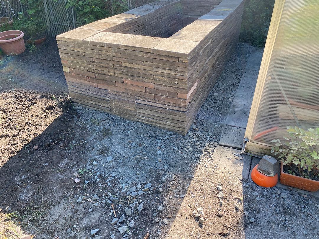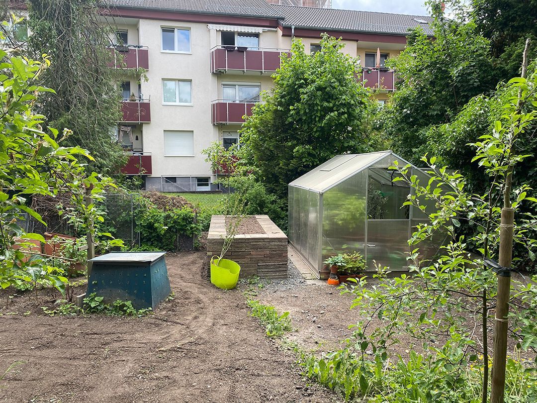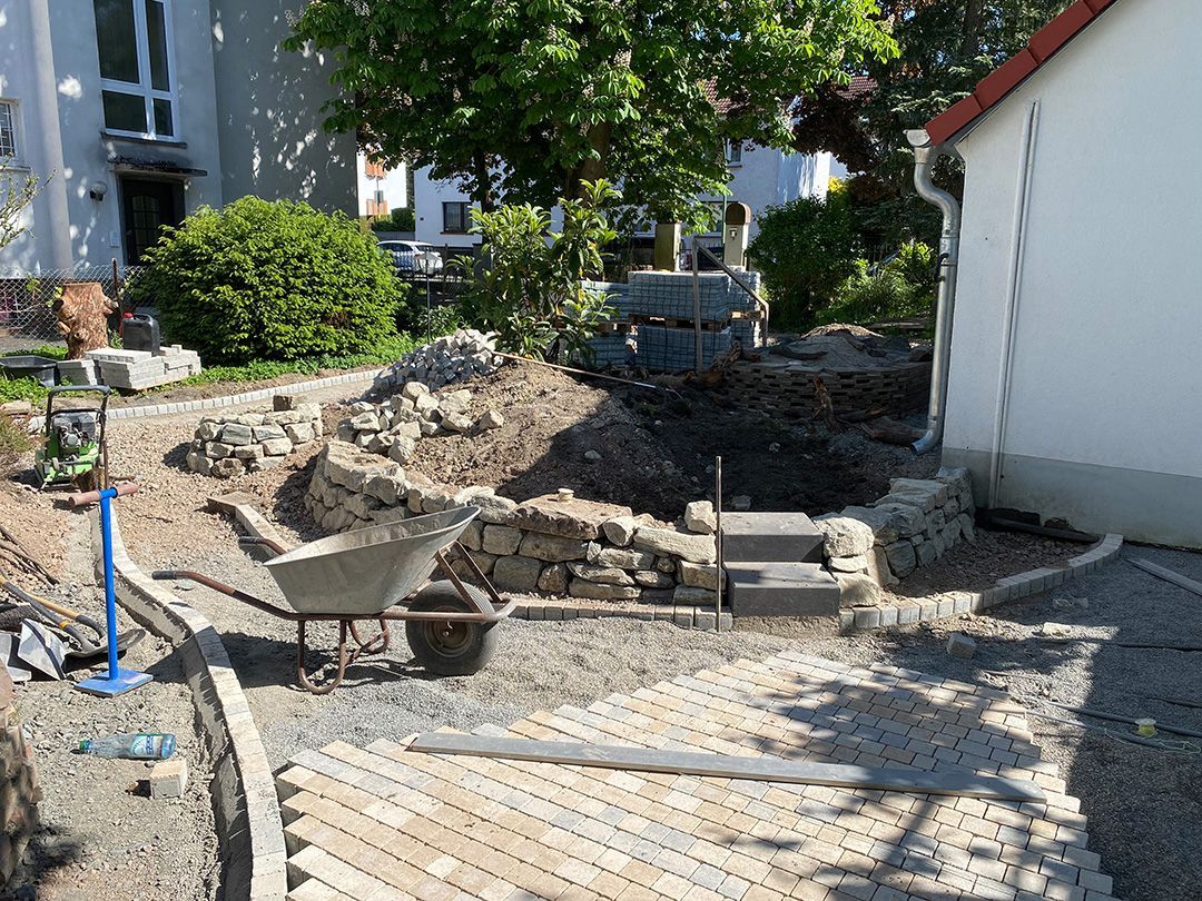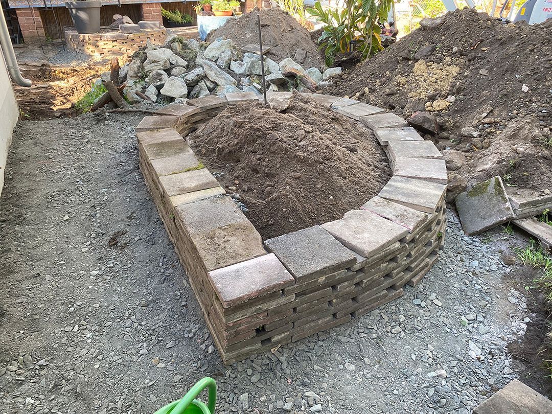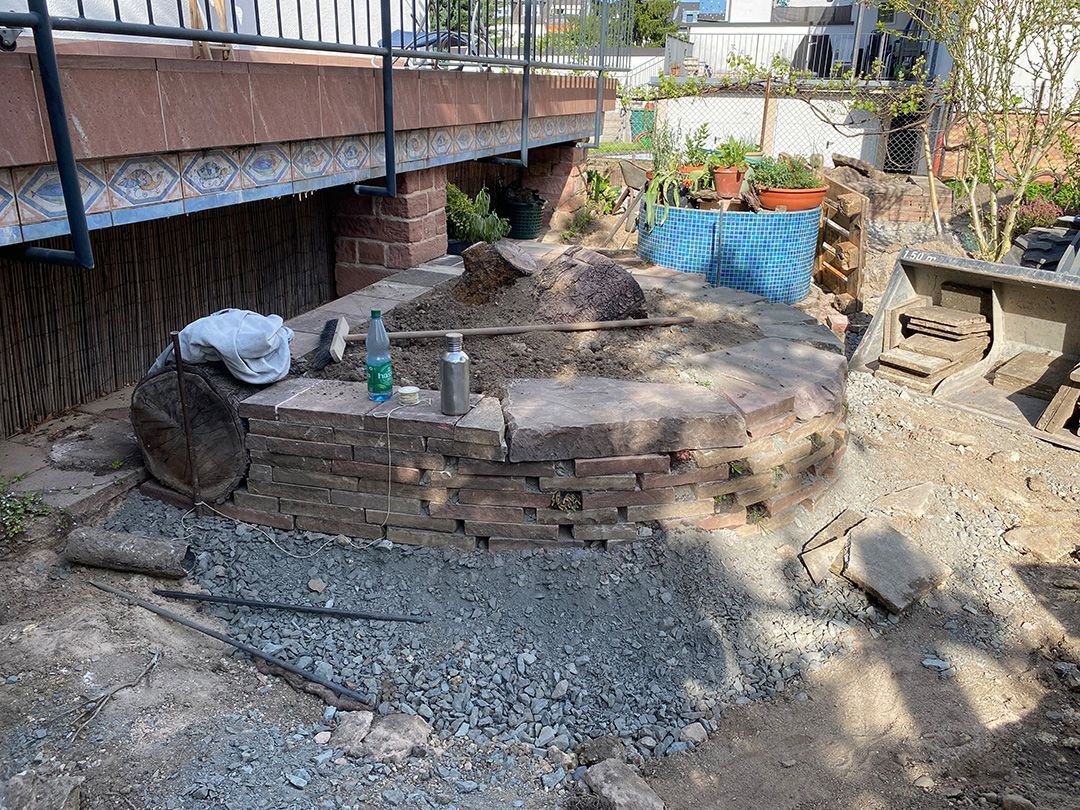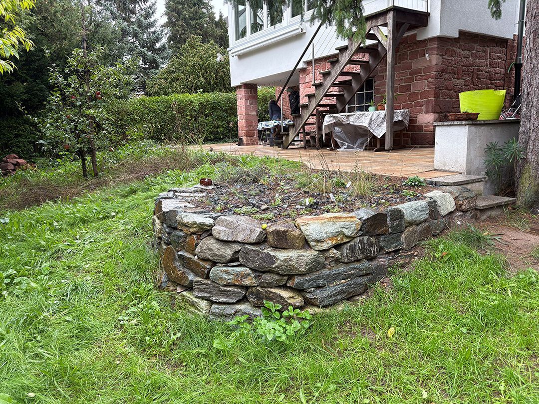 Alle Wege sollten erneuert werden und der Garten pflegeleichter sein. Eine Herausfordung bei über 200qm Betonflächen. Um den ökologischen Fußabdruck dennoch etwas zu senken sollte möglichst alles davon wiederverwendet werden. Umgesetzt in diversen Hochbeeten, gefüllt mit dem vorhandenen Unterbau entstehen diverse unkrautfreie Flächen für Saum, schattige nährstoffreiche und sonnige Magerbeete, Sand-Mager-Rasen, Sandarium bis hin zum Gemüse-Hochbeet. Schon nach einem Sommer sind erste Erfolge zu erkennen.