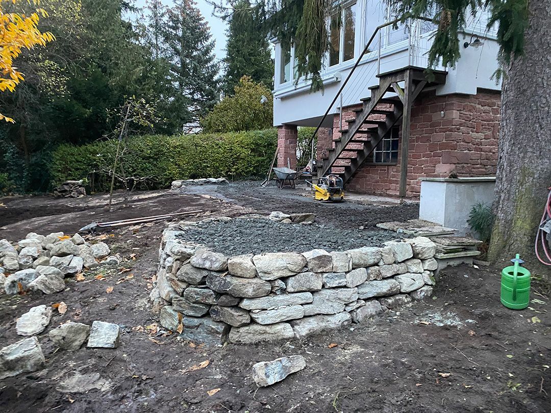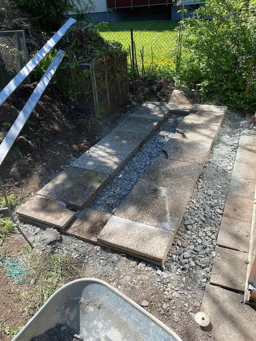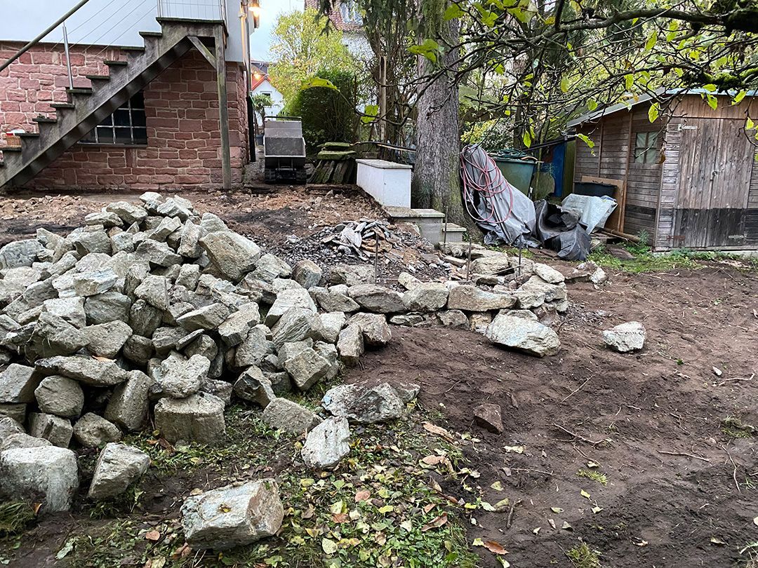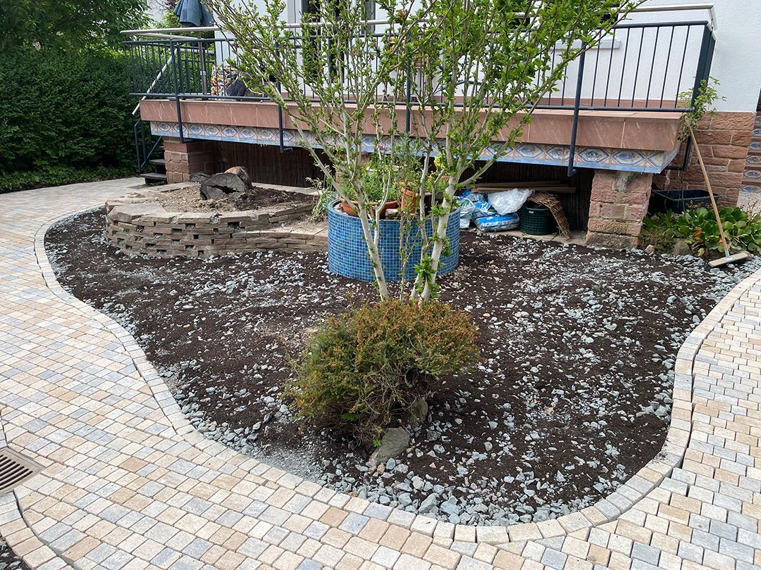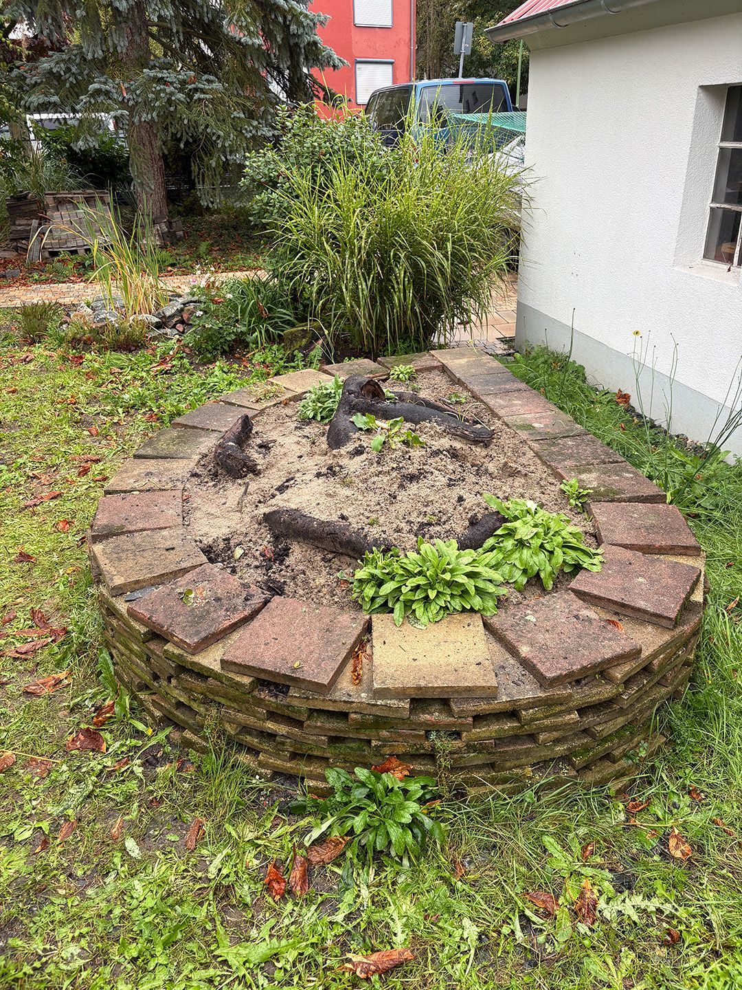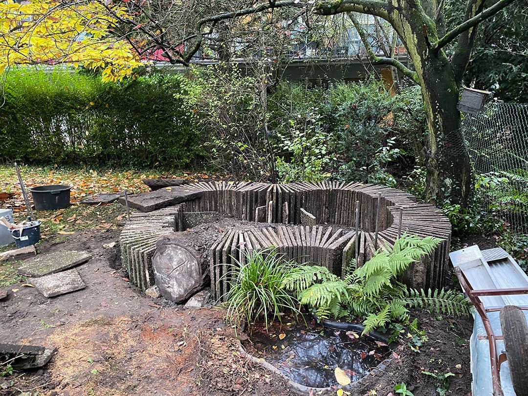 Alle Wege sollten erneuert werden und der Garten pflegeleichter sein. Eine Herausfordung bei über 200qm Betonflächen. Um den ökologischen Fußabdruck dennoch etwas zu senken sollte möglichst alles davon wiederverwendet werden. Umgesetzt in diversen Hochbeeten, gefüllt mit dem vorhandenen Unterbau entstehen diverse unkrautfreie Flächen für Saum, schattige nährstoffreiche und sonnige Magerbeete, Sand-Mager-Rasen, Sandarium bis hin zum Gemüse-Hochbeet. Schon nach einem Sommer sind erste Erfolge zu erkennen.