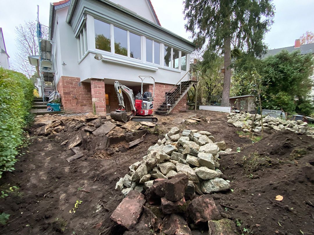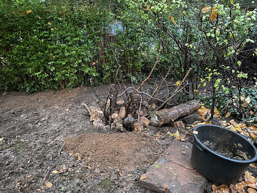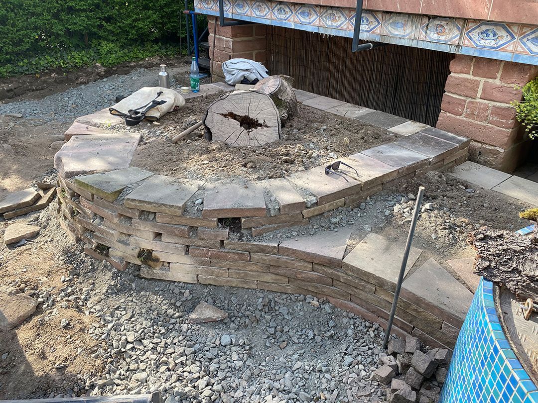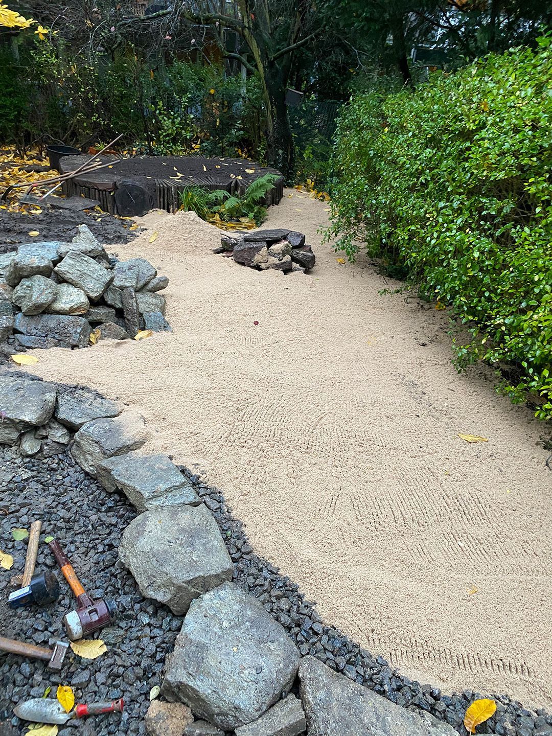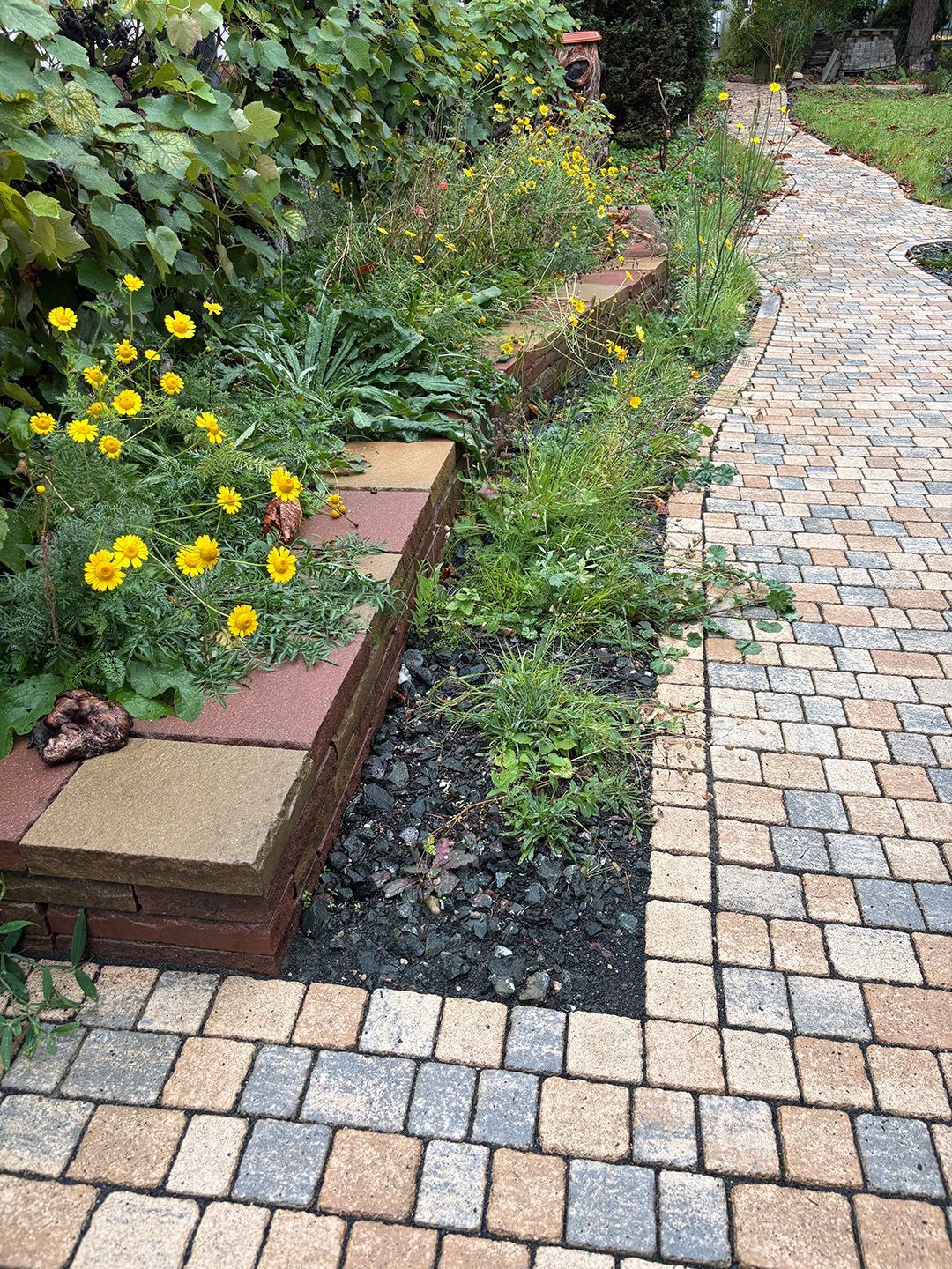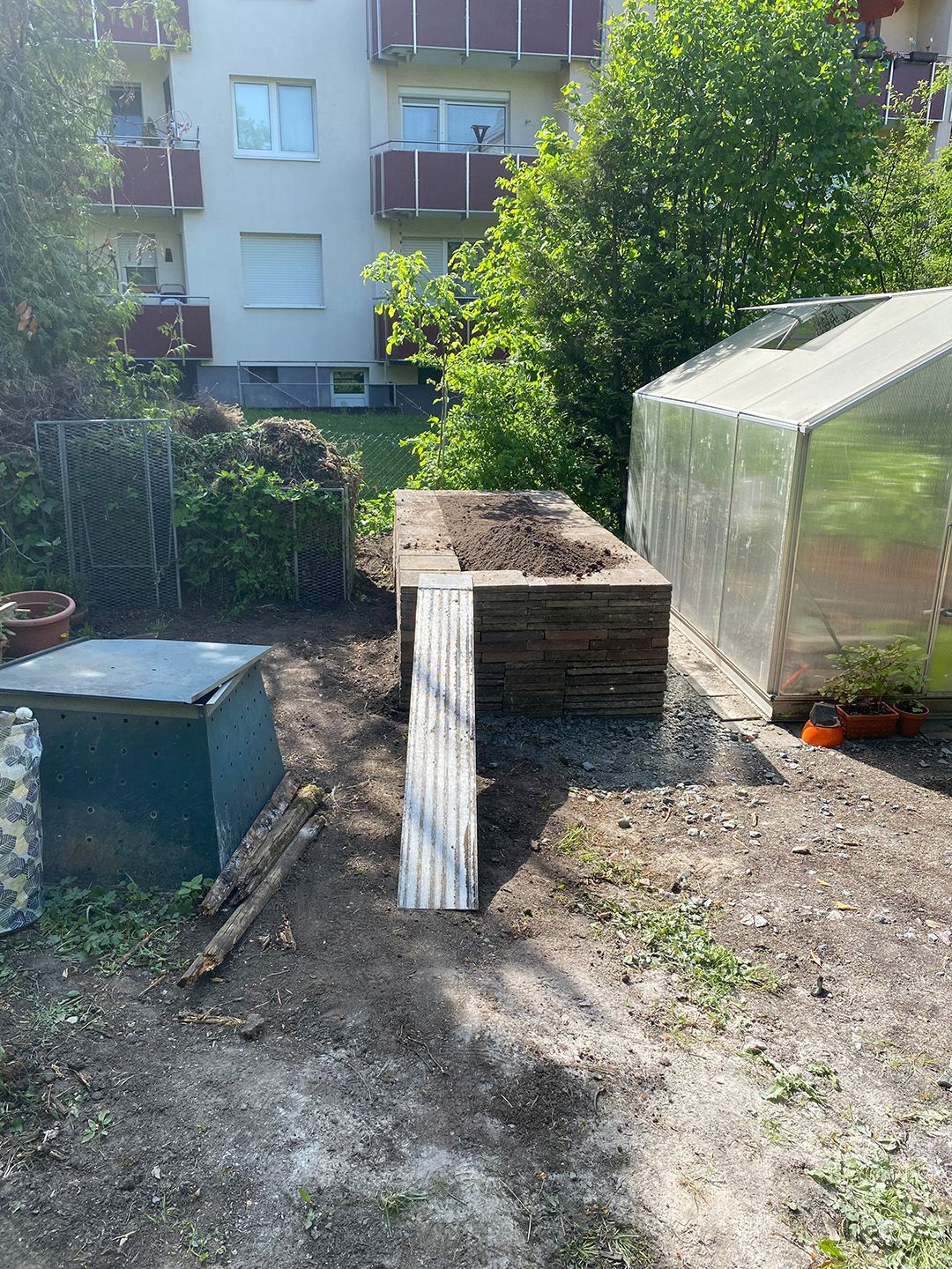 Alle Wege sollten erneuert werden und der Garten pflegeleichter sein. Eine Herausfordung bei über 200qm Betonflächen. Um den ökologischen Fußabdruck dennoch etwas zu senken sollte möglichst alles davon wiederverwendet werden. Umgesetzt in diversen Hochbeeten, gefüllt mit dem vorhandenen Unterbau entstehen diverse unkrautfreie Flächen für Saum, schattige nährstoffreiche und sonnige Magerbeete, Sand-Mager-Rasen, Sandarium bis hin zum Gemüse-Hochbeet. Schon nach einem Sommer sind erste Erfolge zu erkennen.