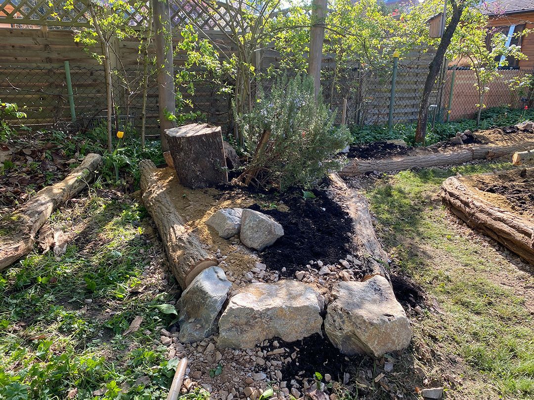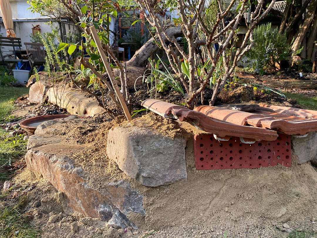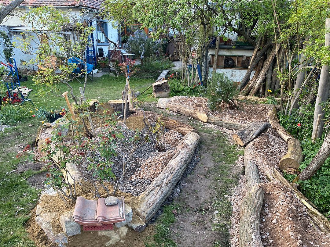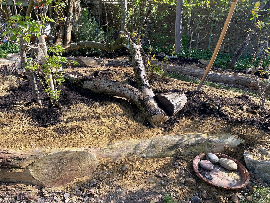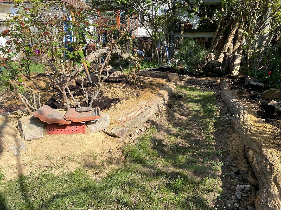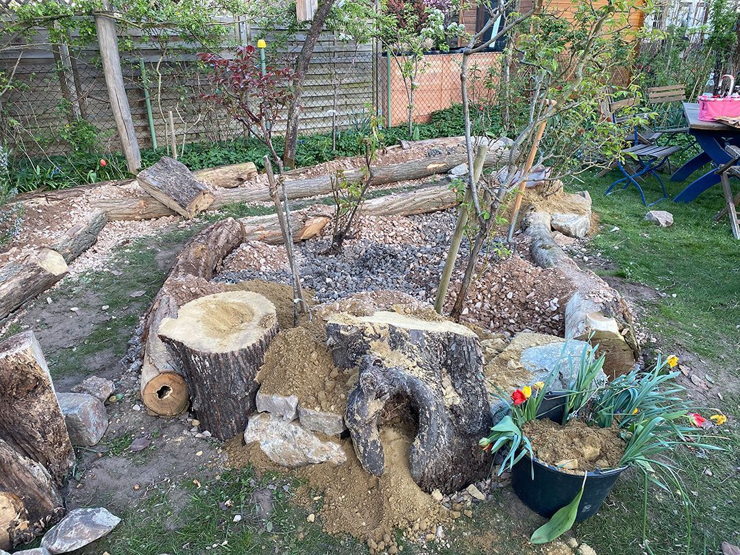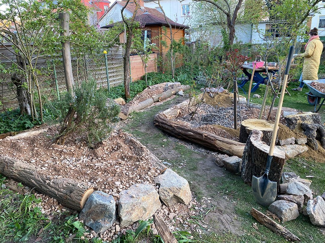 Der Giersch wurde 10cm ausgekoffert und die Inseln 30cm mit einem Schotter-Sand-Kompost-Gemisch aufgeschüttet.
