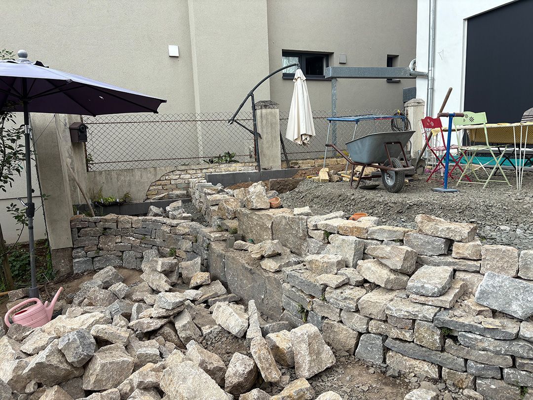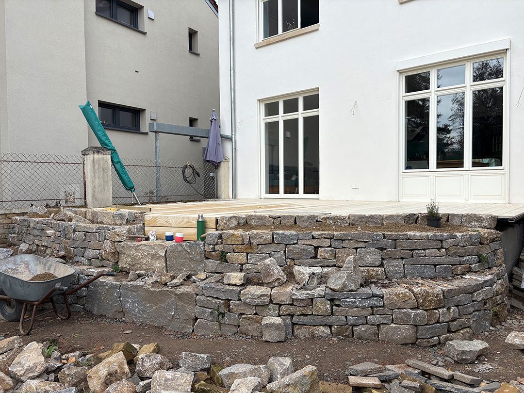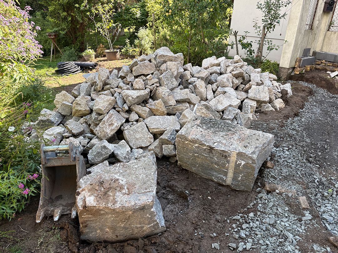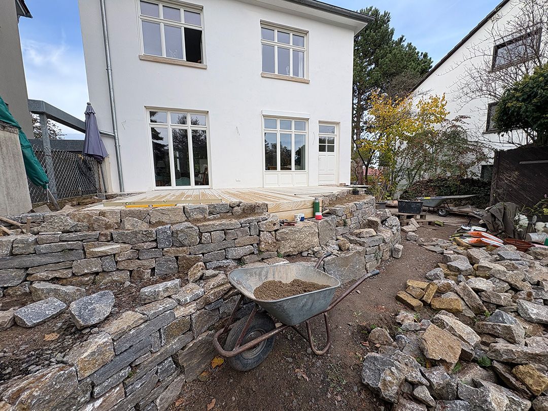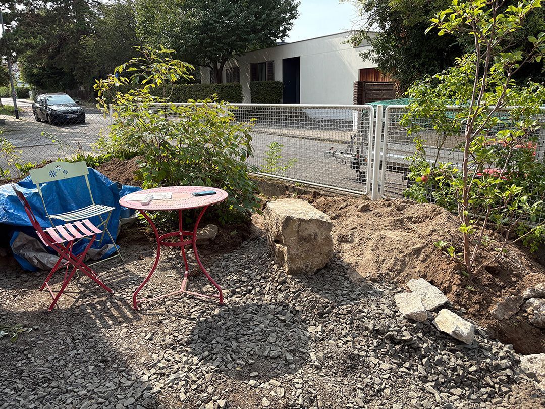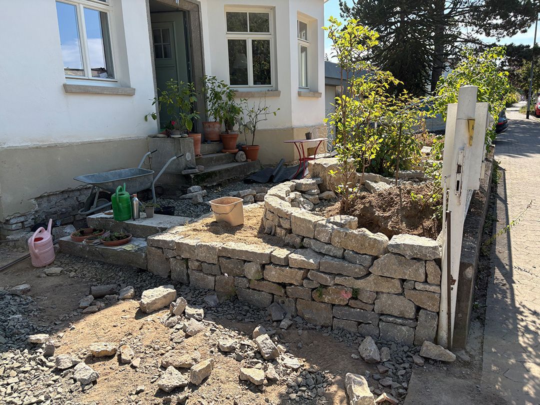 Das erste von drei Terrassenprojekten. Die Idee: Eine große Terrasse mit Blick auf den tiefer gelegenen Garten. Auf der Terrasse soll Platz für kleine Feste sein. In der Trockenmauer sind Sitzquader integriert und zwischen den Mauern ein Magerstandort für trockenheitsverträgliche Stauden angelegt. Passend dazu der Vorgarten.