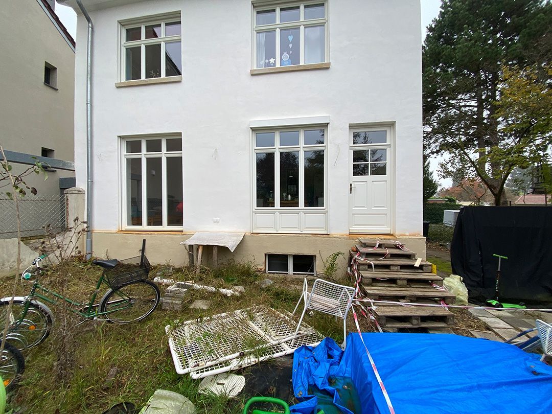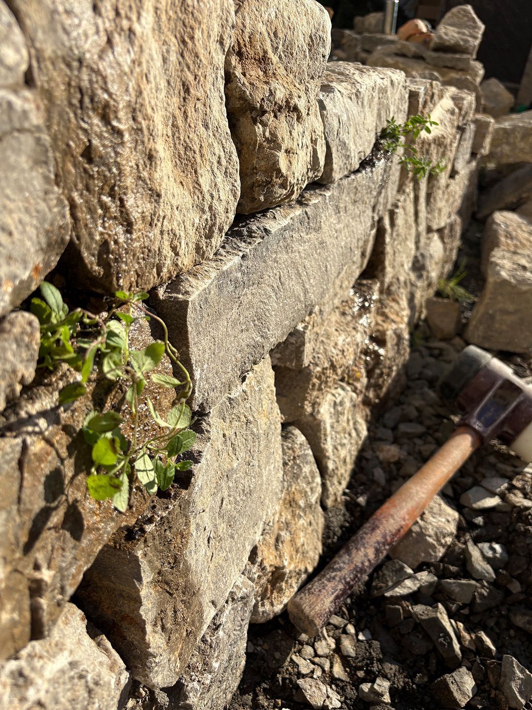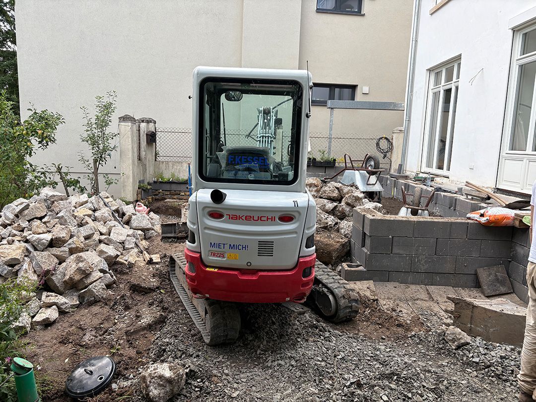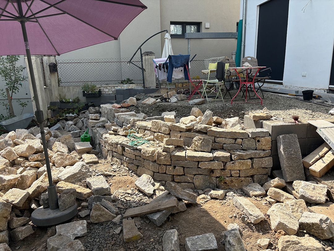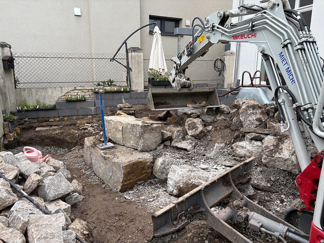 Das erste von drei Terrassenprojekten. Die Idee: Eine große Terrasse mit Blick auf den tiefer gelegenen Garten. Auf der Terrasse soll Platz für kleine Feste sein. In der Trockenmauer sind Sitzquader integriert und zwischen den Mauern ein Magerstandort für trockenheitsverträgliche Stauden angelegt. Passend dazu der Vorgarten.